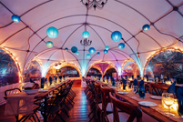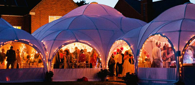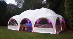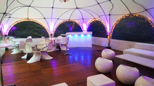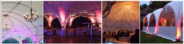 The domes look pretty with lots of fairy lights plus the odd splash of colour from uplights and footlights. In the centre we can hang chandeliers, light 'sprays' or a mirror ball.